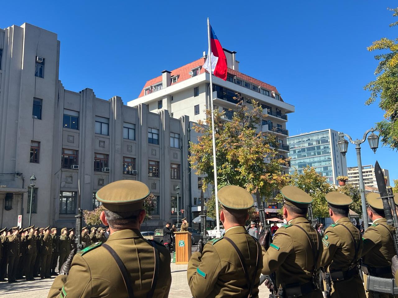 TALCA.- Con un solemne acto de izamiento del Pabellón Nacional en la Plaza de Armas de Talca, Carabineros de Chile dio inicio al mes aniversario de su fundación hace 97 años.